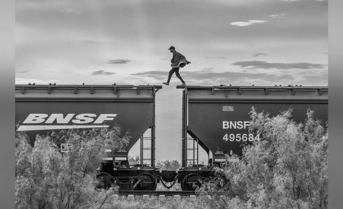 Ruben Soto (right) a migrant from Venezuela, with Rosa Bello, a Honduran migrant, on top of the train known as “The Beast”. Samalayuca, Mexico 2023. From the series “The Two Walls”