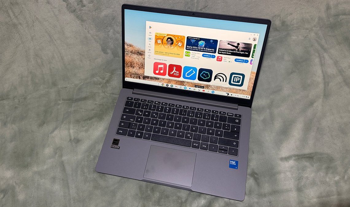 The model we tested features an Intel Core 3-N355 processor, combined with 8 GB of RAM (LPDDR5, 4,800 MHz) and 128 GB of eMMC storage. This configuration clearly sets it apart from many entry-level Chromebooks, which still come with 4 GB of RAM and slow storage. Right from the first start, it’s noticeable how quickly ChromeOS boots up and how responsive the system is in use.