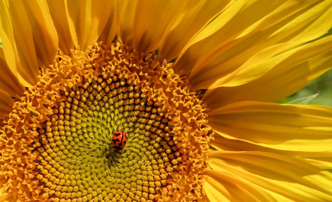 Image description: Samuel was inspired to take the photo because he says yellow is a ‘happy color’ and he thought the ladybird looked wonderful against the vivid yellow of the sunflower.