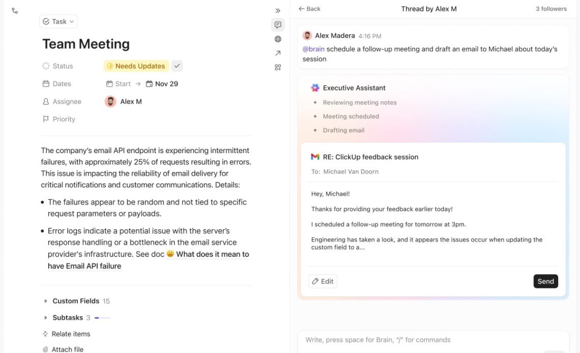 The other assistant, called Brain, is a more general-purpose assistant that can generate ideas, perform tasks like scheduling a meeting based on the availability of teammates, add a comment under a task, or create a new one. It can also access the web and other integrated tools, analyze reports, and create drafts. Just like many other AI assistants, Brain also lives in the sidebar and is accessible anywhere on the ClickUp interface.