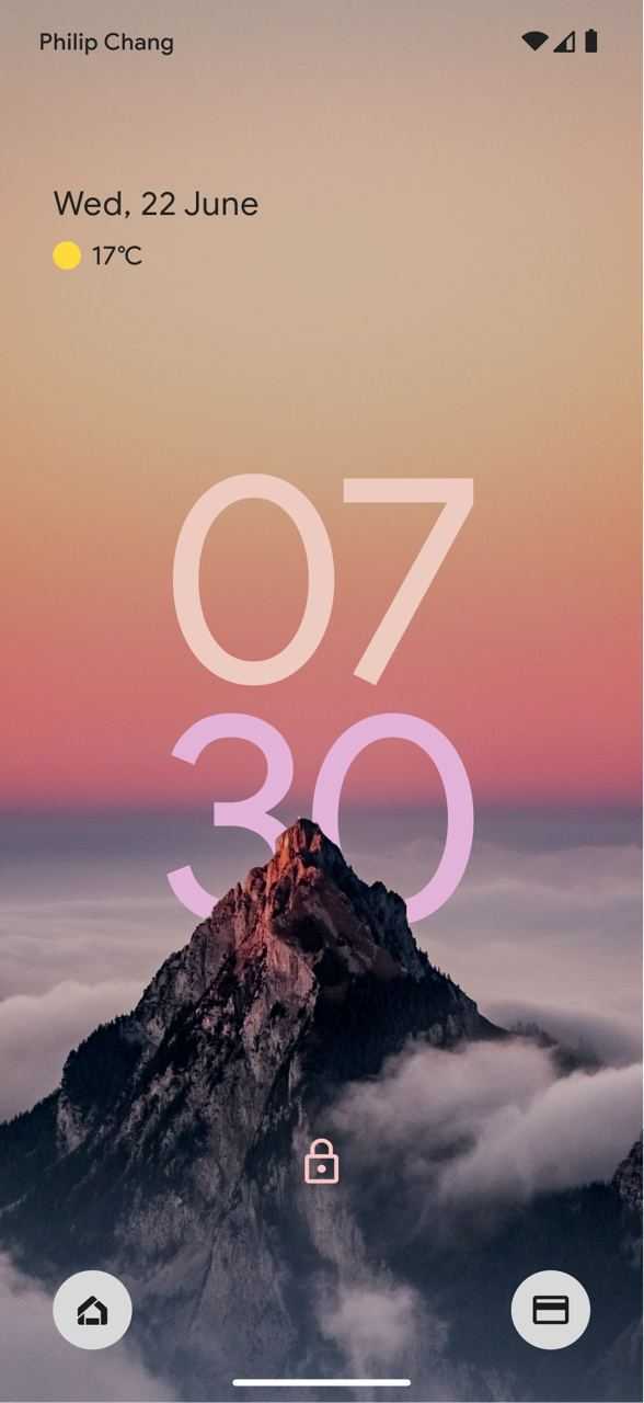 The Android lockscreen on Pixel phones today starts with the day/date in the top-left corner, while weather (condition and temperature) is underneath. Above this At a Glance widget is Android’s status bar where the carrier is noted at the left and the right shows battery percentage and connection statuses. At the bottom of the lockscreen, you get a shortcut to open smart home controls and Google Pay (soon Google Wallet).
