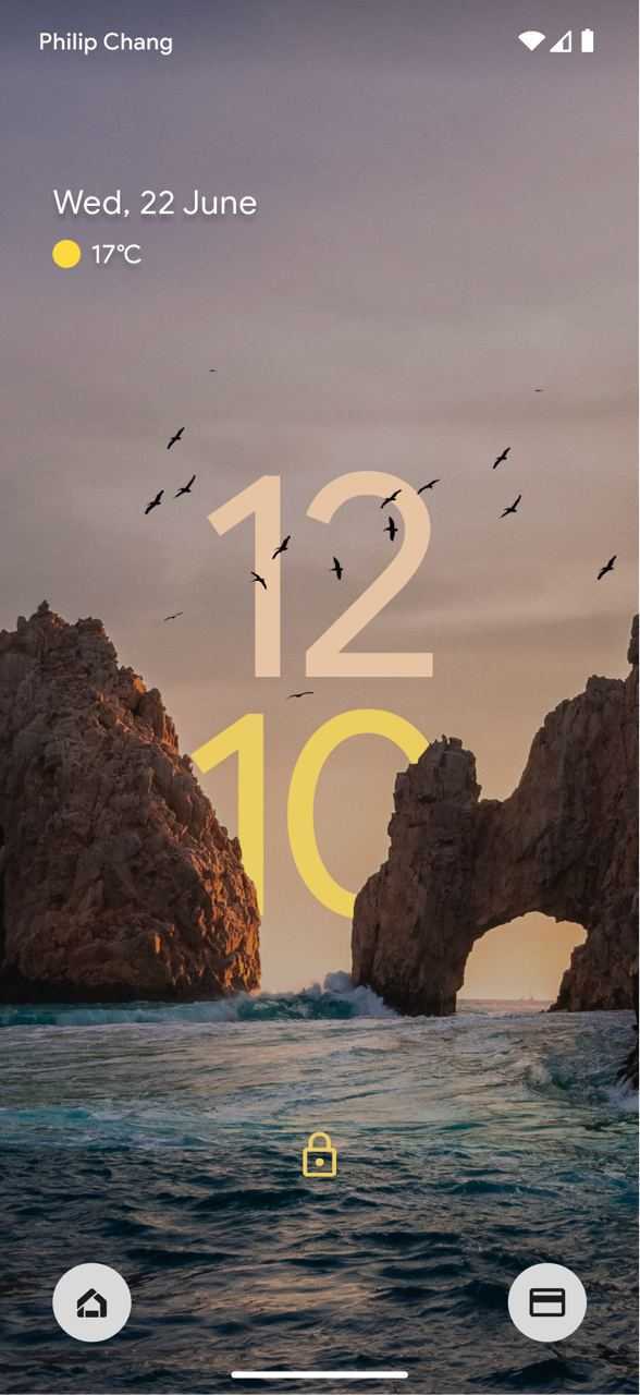 Designer Philip Chang (Twitter + Instagram) took inspiration from iOS 16 to imagine what the Android lockscreen could look like in the future. Namely, depth is applied so that the clock also adapts to what’s in the actual background image. In the example seen above, “10” is displayed behind the rock formations and the seagulls are clearly layered above the “12.” Also note how the hours and minutes are using different colors.