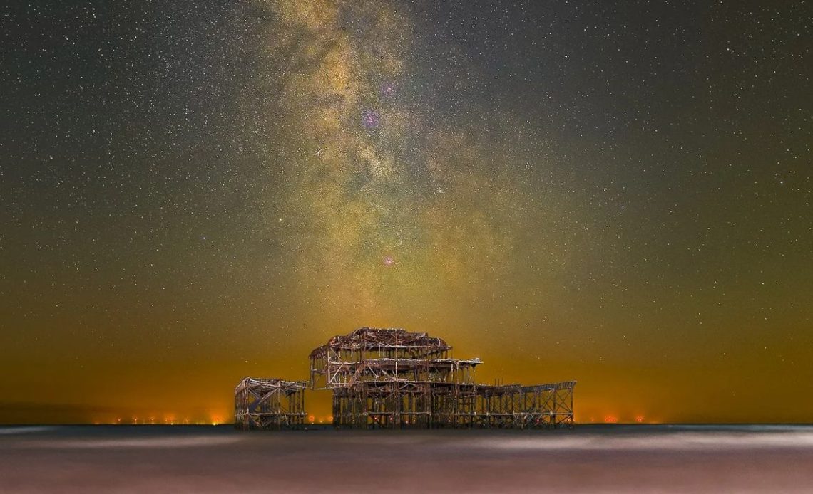 The resulting image shows our galaxy rising like a ghostly ribbon above the skeletal remains of the Grade I-listed West Pier, framed by the glow of distant wind farms. Orange clouds of dust and gas swirl across the galactic core, while the pinkish tones of the Eagle (M16), Omega (M17), and Lagoon (M8) nebulae punctuate the scene. All details you’d assume would be impossible to capture in a city rated Bortle 6 on the light pollution scale.