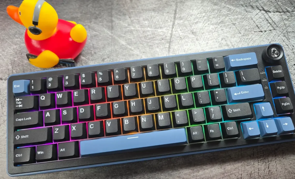 At first glance, the OK-M looks like a pretty standard 65% design, and it is. But there are a few notes of distinction that make it a little more appealing. The ABS black plastic casing gets a bit of flare from a bit of blue trim, highlighted by the same hue on the space bar, Escape, Backspace, Enter, and arrow keys.