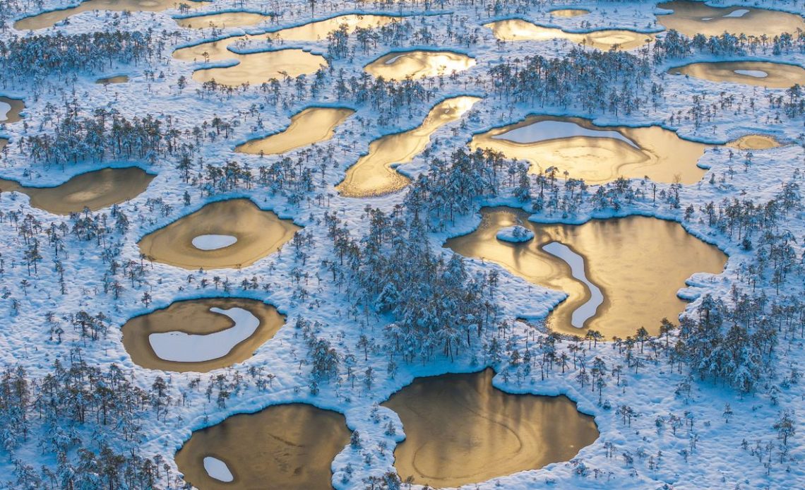 Put all that together, and the elevated perspective transforms the frozen peat pools into something mysterious and compelling, with golden light contrasting beautifully against organic, irregular shapes dotted with frost-covered trees.