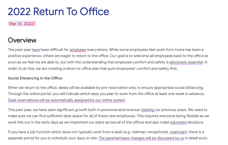 In addition to Smart Compose, grammar corrections, and spelling autocorrect, Google Docs is now rolling out writing suggestions that feature a purple underline to help with tone, style, and word choice.