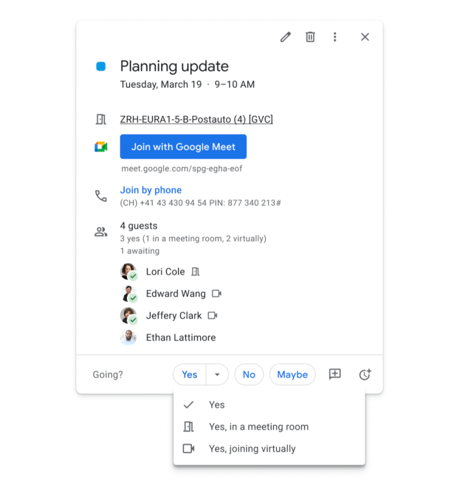 Another improvement to the Meet experience will let you specify on an RSVP whether you’re joining a call virtually or in person.