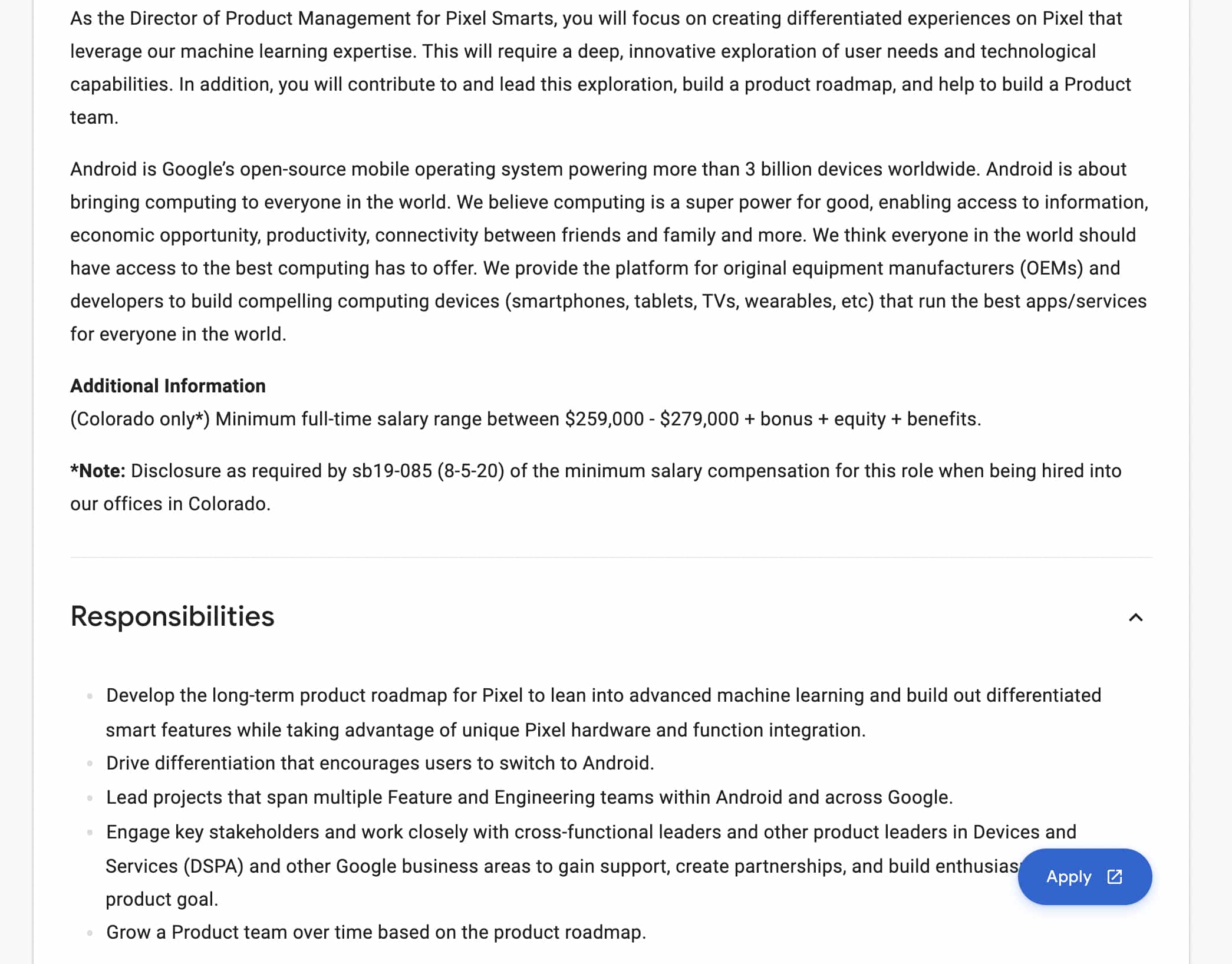 As the Director of Product Management for Pixel Smarts, you will focus on creating differentiated experiences on Pixel that leverage our machine learning expertise. This will require a deep, innovative exploration of user needs and technological capabilities. In addition, you will contribute to and lead this exploration, build a product roadmap, and help to build a Product team.