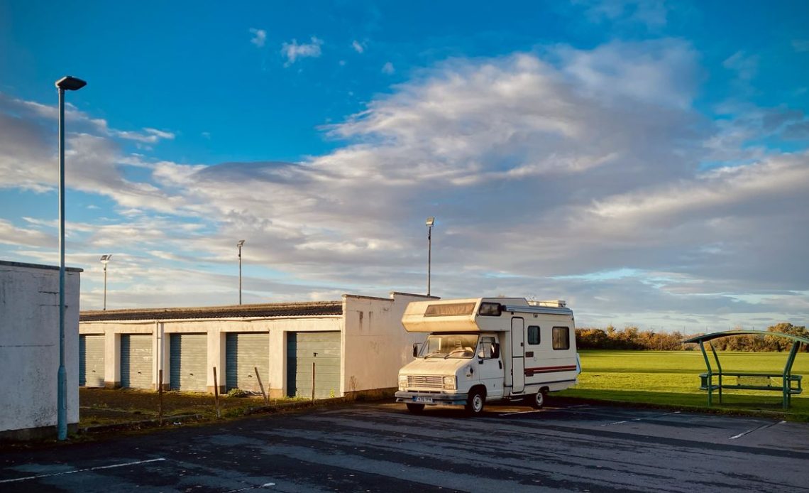 The sun cast some great side-light on the motorhome, and created some fantastic contrast with the motorhome and rank of garages lit up, but the surrounding carpark and building in shadow.