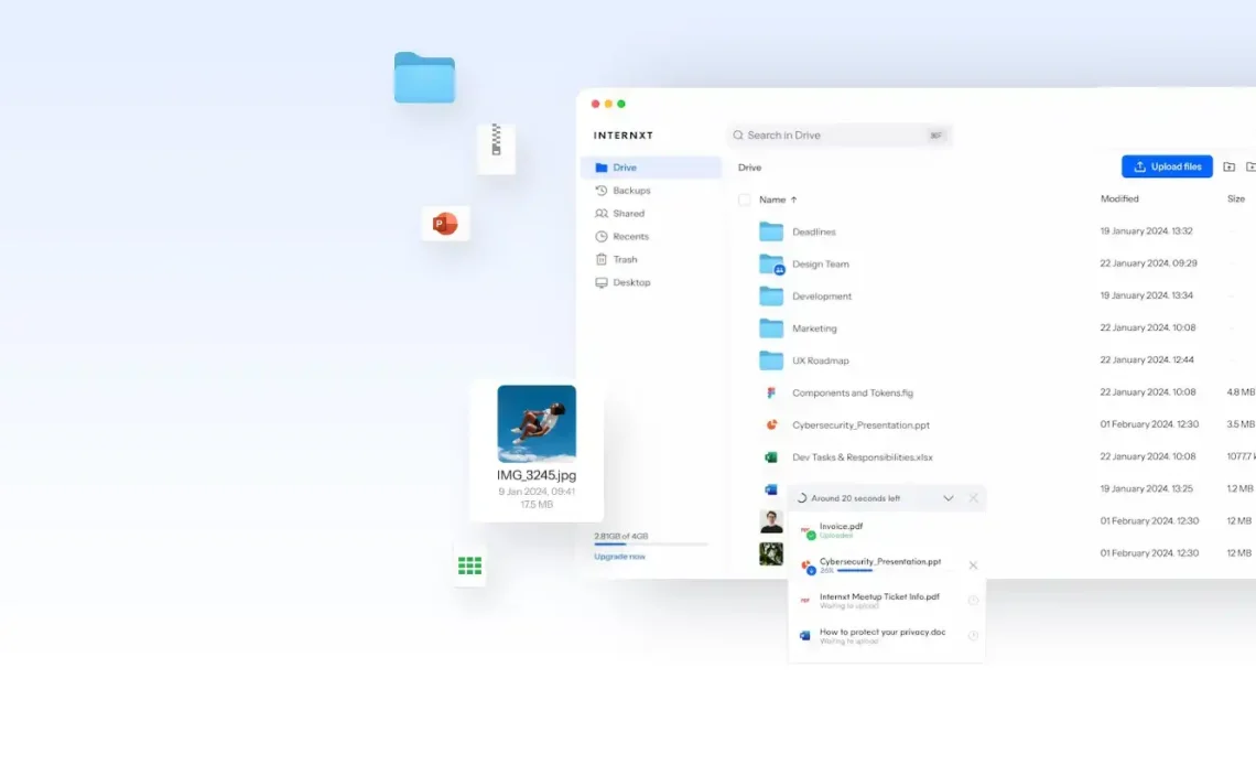 You can now upload your first file to the cloud via the user interface. In the file selection, navigate to the directory on your computer, select one or more files, and confirm the transfer by clicking Open. Alternatively, install the Internxt Drive desktop software. There are also mobile apps for Android and iOS.