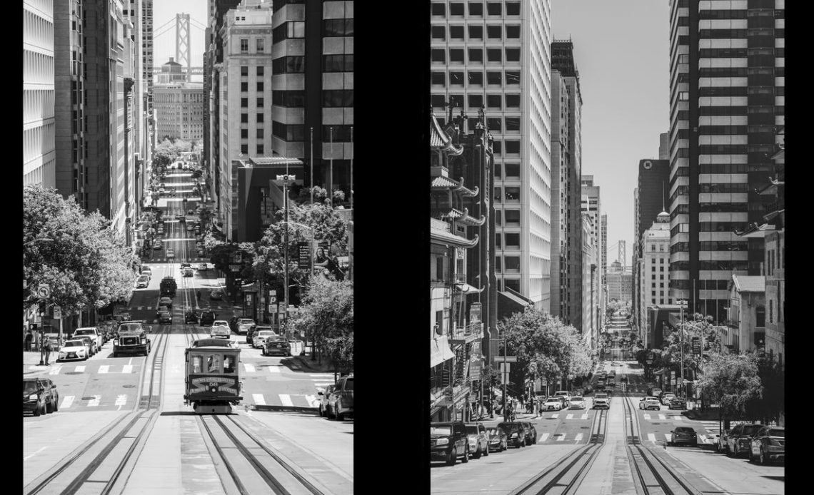 After lots of research and talking to various locals, I worked out California Street was the best location to shoot. Its range of steep, stepped hills and the glimpse of San Francisco to Oakland Bay Bridge framed between the city’s tall buildings at the end.