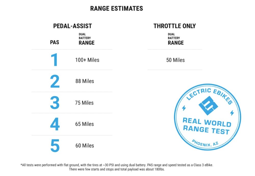 Lectric eBikes has performed real-world range testing with the values shown below. They say you’ll get between 50-100 miles (80-160 km) depending on how you ride.