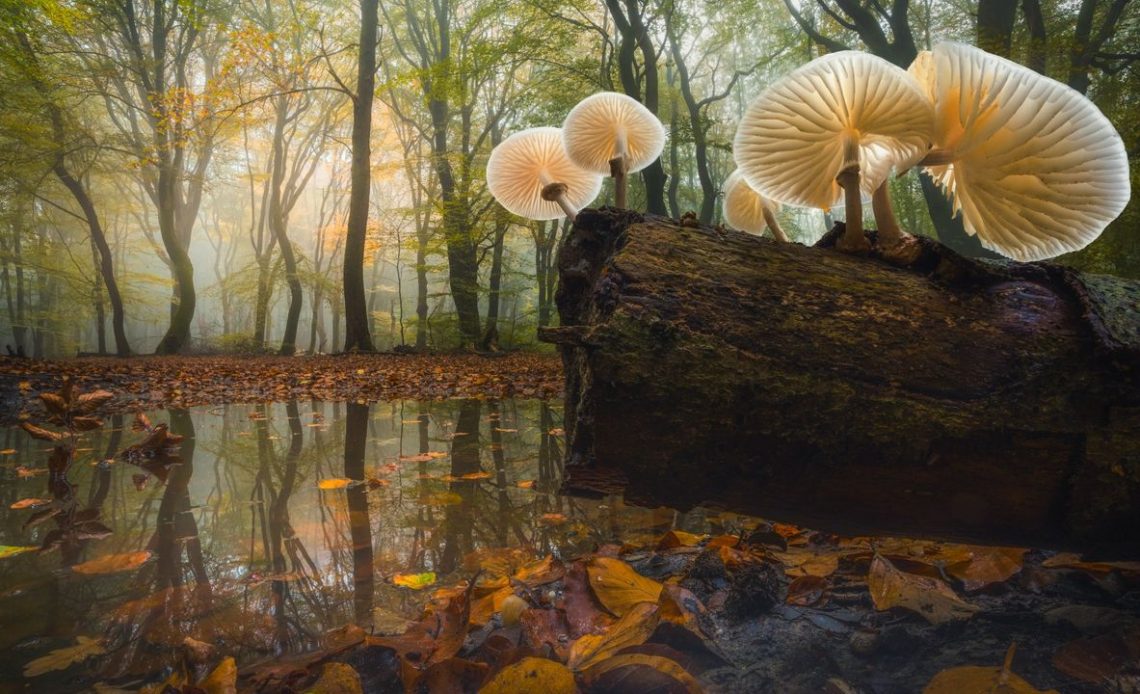 Tech specs aside, what sets Porcelain Dance apart is Dros’s willingness to see beyond the obvious. Many people would simply walk past these mushrooms, which appear unremarkable from above. Instead, his curiosity led him to explore an unusual angle – looking up from beneath the fungi – transforming ordinary woodland mushrooms into ethereal, glowing sculptures.