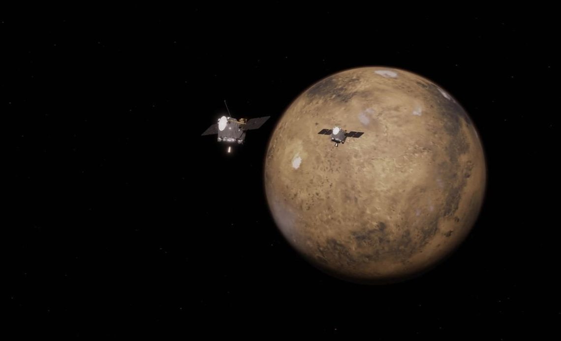 After reaching Mars in September 2027, the robotic duo will spend about seven months fine-tuning their orbits before flying in formation, like a “pair of pearls on a string,” coming within 100 miles (160 kilometers) above the surface. If all goes to plan, after six months of joint observations, they will separate into different orbits for another five months to build a 3D map of how energy and matter flow between Mars and the solar wind, the process that controls atmospheric loss.