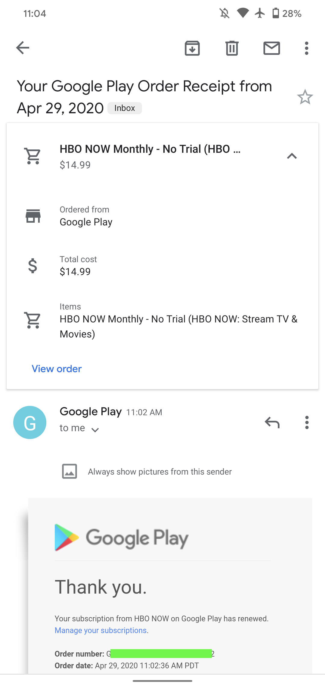 When you receive a flight confirmation or email about an order, Gmail on mobile will now show a card just underneath the subject line. It includes keys details pulled from the body of the message: take-off and landing times, flight duration, passenger name, seat, and confirmation number. Multiple cards can appear in the case of departing and return flights.