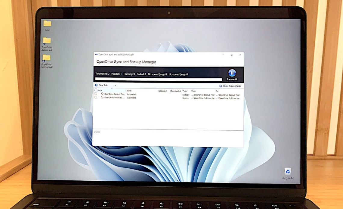 The Windows OpenDrive backup and sync client offers several types of tasks: Backup, where files online are never deleted, as well as Synchronization — a two-way sync where changes to either folder are implemented upon the other.