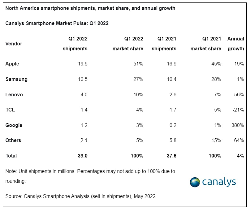 A new report from Canalys breaks down market share for smartphones shipped in the United States and North America as a whole during Q1 2022. The market grew by 4% in total amid inflation pressure.