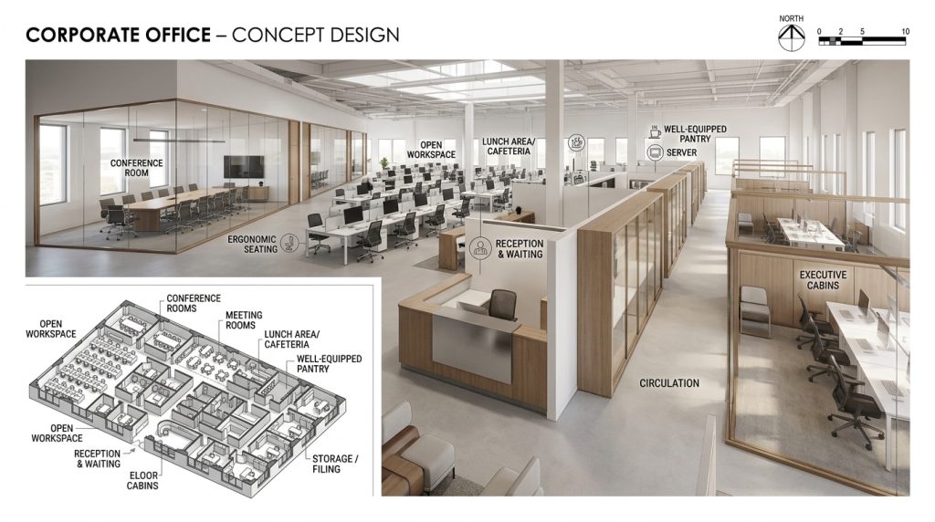 Office operators and workplace teams could use it to explore density, collaboration zones, cabins, and amenity layouts without waiting for traditional concept cycles.