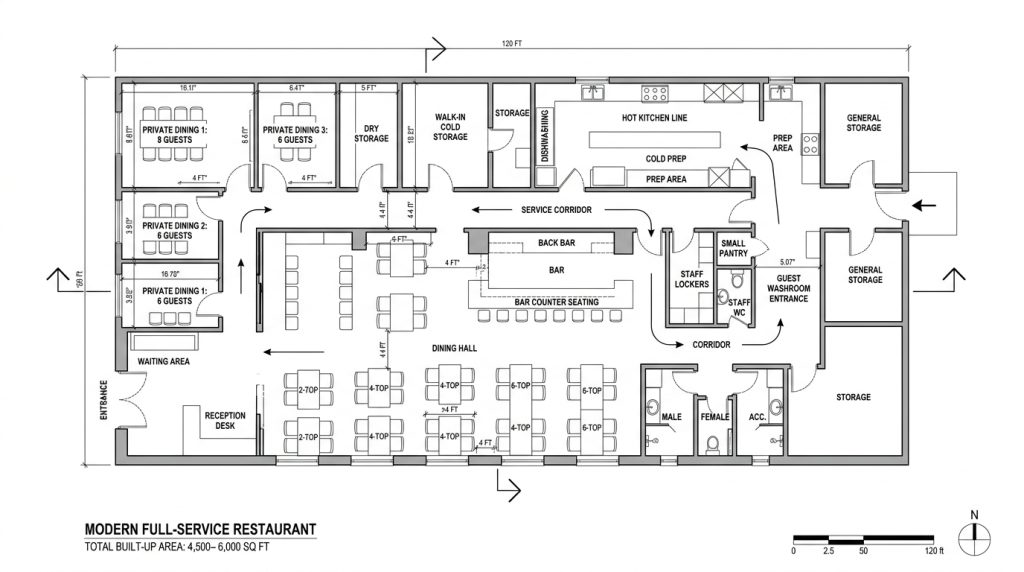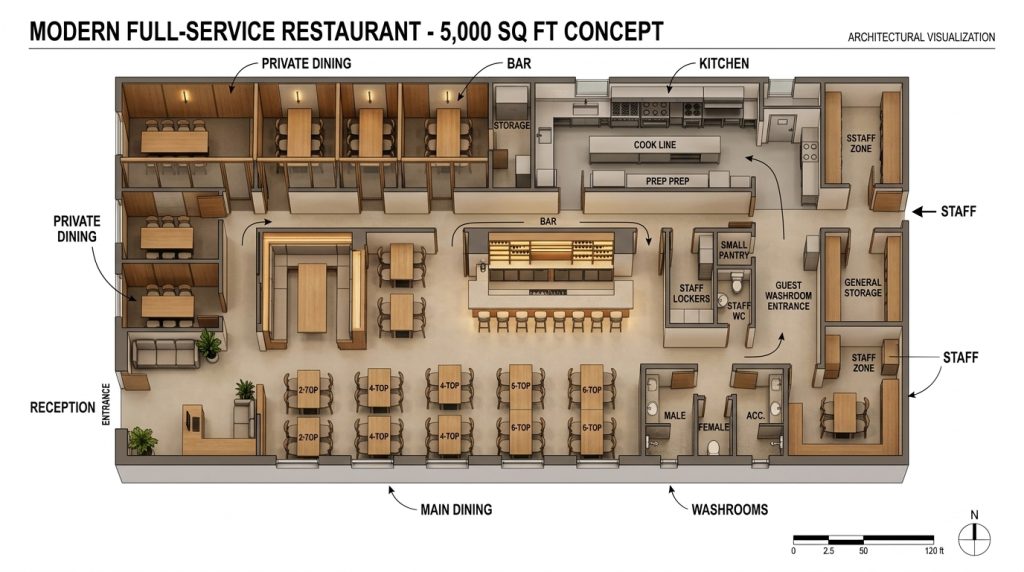 The restaurant example extends the same idea into hospitality. Guest seating, private dining, bar placement, prep, kitchen flow, storage, washrooms, and staff movement all appear as part of an integrated concept. Even where technical accuracy still needs professional checking, the system is no longer operating at the level of generic inspiration.