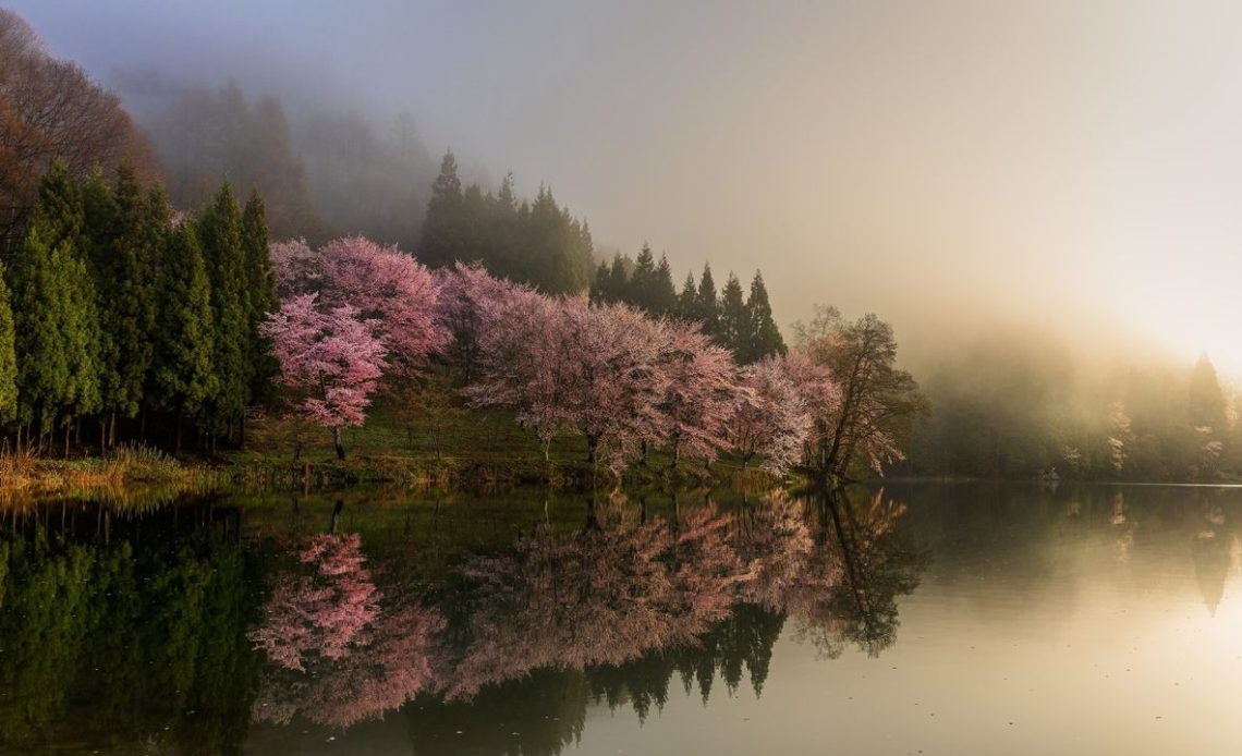 In the misty dawn following heavy rain, photographer Megumi Murakami waited patiently at Lake Nakatsuna in Nagano Prefecture, Japan. As the morning light pierced the fog and the cherry blossoms emerged in full bloom, their perfect reflections on a glassy lake surface created what she describes as “a fantastical world.”