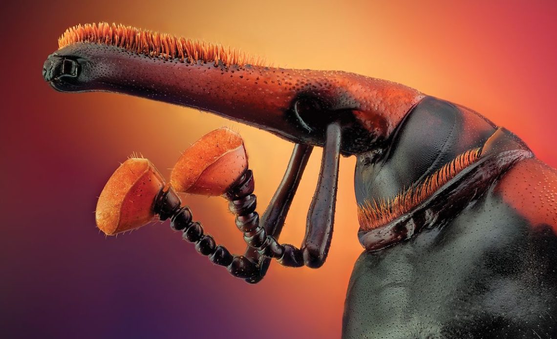 “Only male weevils like this have bristles on their snouts, which they use to detect signals from females. When shot very closely, the antennae can look like boxing gloves.””