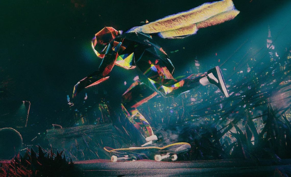 Boss battles are handled in an interesting way, and to win these encounters you need to build up combos and “stomp” them down inside a marked zone. They can be cleared with a bit of mild button-mashing, but there’s certainly room to be much more deliberate about your trick selection and timing if you choose to (and you will, admittedly, accumulate better combos and deal more damage – and faster – if you do). There are also a number of small and trippy sandbox-style levels to cruise around with various objectives to complete, but some of these tasks do get disappointingly trivial. For instance, one mission that called on me to gather up a selection of floating letters sounded like a cute nod to Skate Story’s ancestors – but most of them were just hovering at ground level, turning what could’ve been a brief but fun challenge into a basic fetch quest across the map and back.