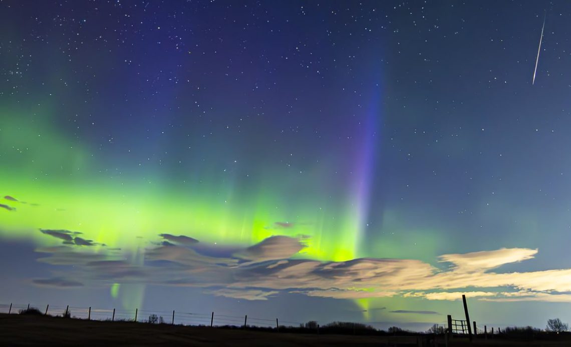 Astrophotographer Harlan Thomas captured a spectacular early morning natural light show on April 20, as a Lyrid meteor photobombed the northern lights above Alberta, Canada.