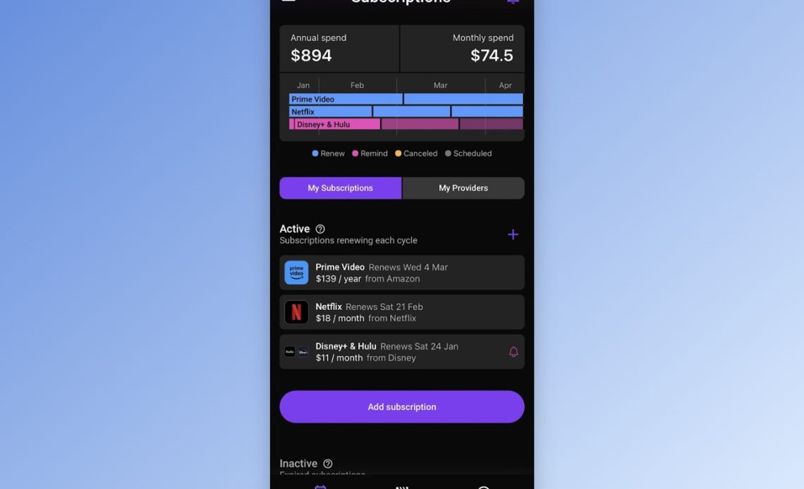 StreamWolf provides an overview of all your streaming subscriptions, shows you the total cost, and lets you cancel (or reactivate) individual services with just a button tap. It also offers some watchlist features so you can plan what to pay for at any given time.