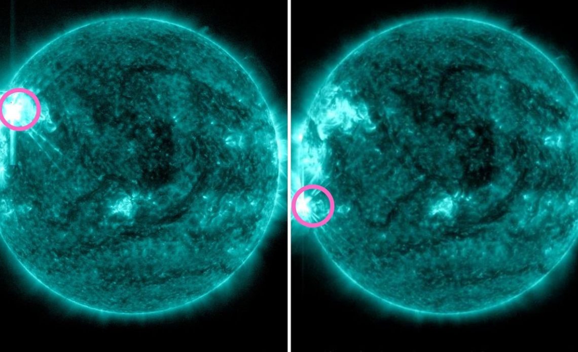 The first eruption, an X1.8-class flare, exploded from sunspot AR4274 and peaked at 12:34 p.m. EST (1734 GMT). It triggered a strong R3 radio blackout across much of North and South America. A few hours later, at 5:02 p.m. EST (2202 GMT), a second X.1.1-class flare erupted from a region still hidden beyond the sun’s southeastern limb, triggering another strong radio blackout across the North Pacific Ocean, New Zealand and parts of eastern Australia.