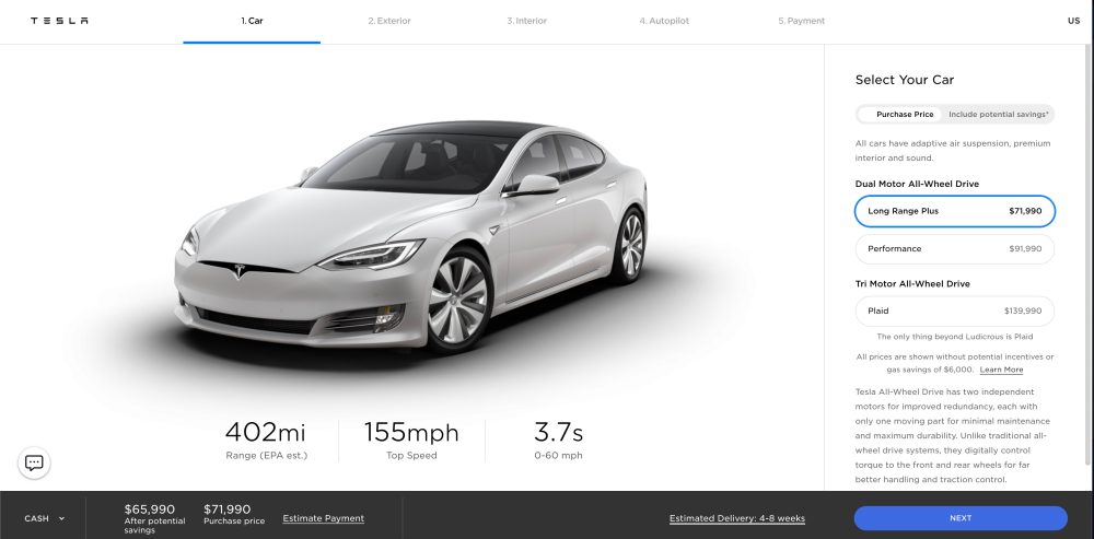Tesla is currently estimating a 4 to 8 weeks delivery time for both versions of the Model S in the US.