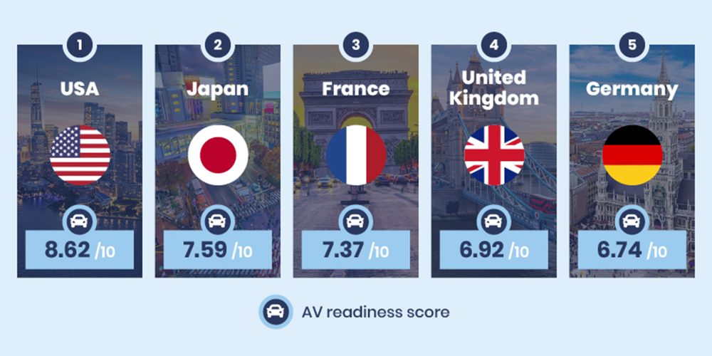 This includes considerations such as legislation, technology, consumer interest, and infrastructure. By scoring each one of the categories for each country, the study was able to combine them and average out an “AV Readiness score.”