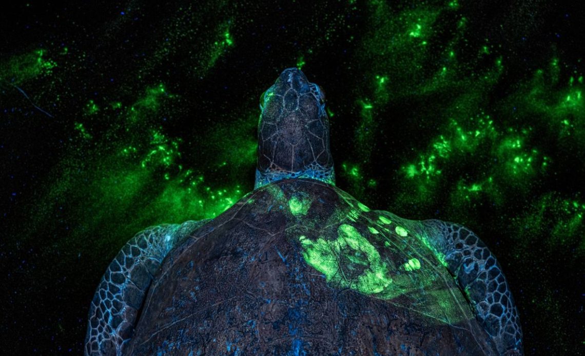 Handprint on Sea Turtle looks, at first glance, like a digital artwork or a still from a sci-fi film: a green sea turtle rendered in deep purples and blues, surrounded by neon-green constellations of light. Look closer, and you’ll spot a human handprint glowing on its shell. That’s not post-processing. It’s forensic science, photographed under ultraviolet light.