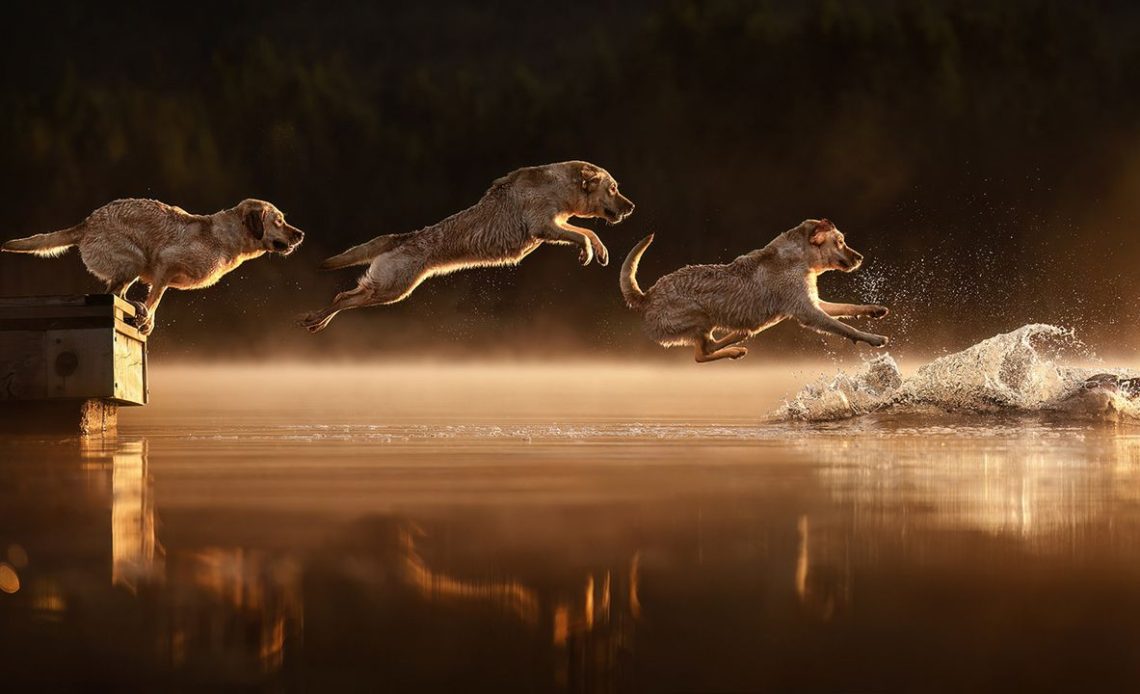 A golden retriever leaps off a dock into a misty lake at sunrise, captured in a series of superimposed images showing its joyful splay as it enters the water.