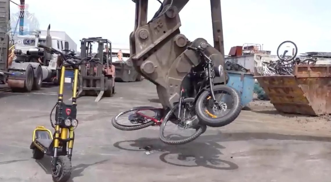 In Western Australia, a recent enforcement effort known as Operation Moorhead has resulted in dozens of electric scooters and off-road electric bikes being confiscated and destroyed, according to a local ABC affiliate. The police shared footage of an excavator fitted with a grapple attachment crushing the micromobility devices and loading them into a large steel dumpster.
