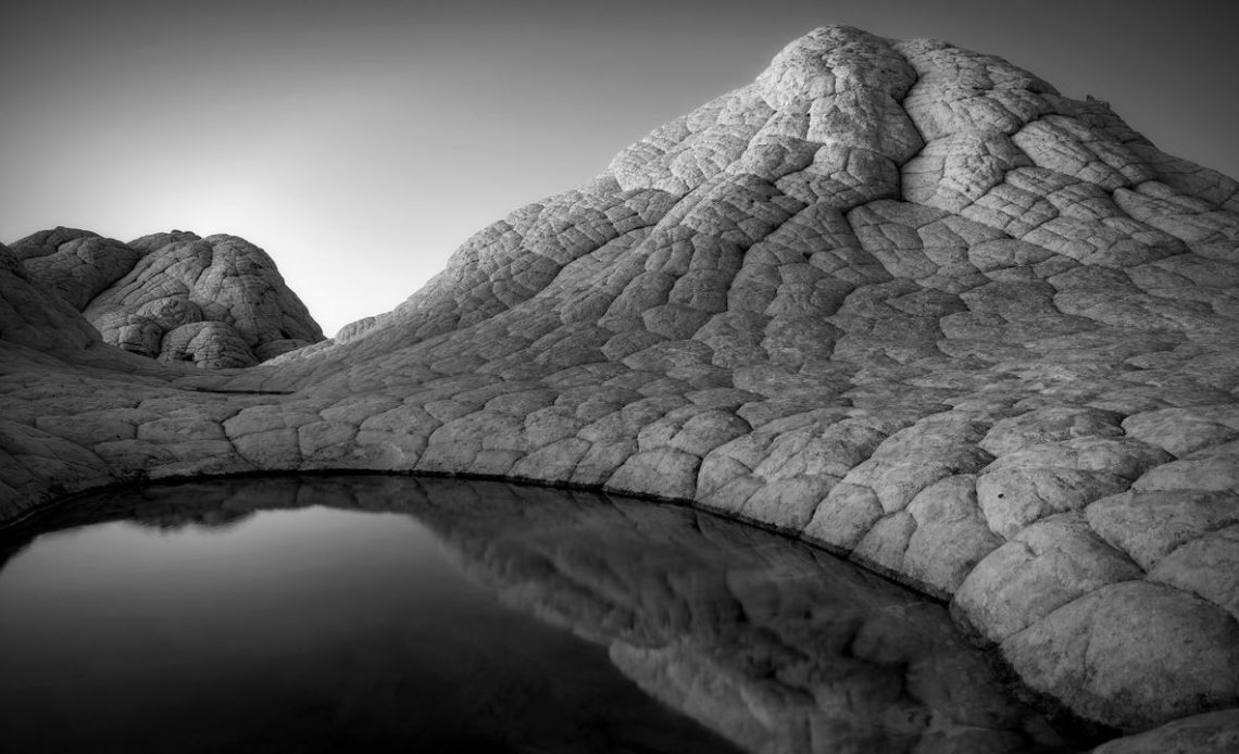 The first thing that strikes you is the otherworldly simplicity of the scene. Brain-like sandstone formations rise from a mirror-still pool, their weathered surfaces rendered in shades of grey that emphasize every curve and crevice.