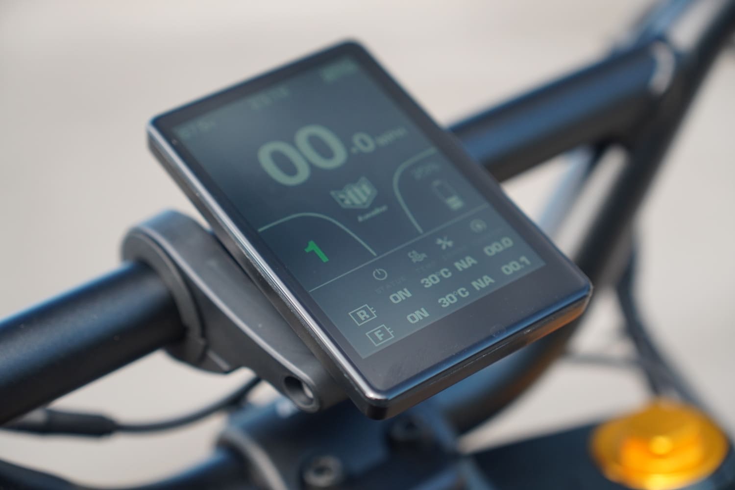 - Extras: Dual charging ports, beefy side kickstand, pair of really bright headlights, taillights, turn signals, beautiful color TFT anti-glare screen, USB charger port, motorcycle horn, mud flaps, single/dual motor operating modes, comfortable thumb throttle