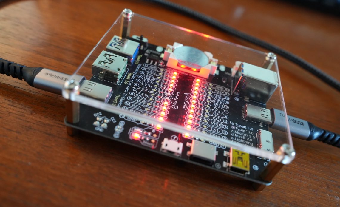The tester’s small, clever circuit board is powered by an inexpensive CR2032 button battery and offers a number of USB ports. In addition to two USB-C 3.0 ports, there are two USB-A ports (USB 2.0 and USB 3.0) as well as mini-USB, micro-USB, Type-B, Lightning, and a hard drive connector (Micro-B 2.0).
