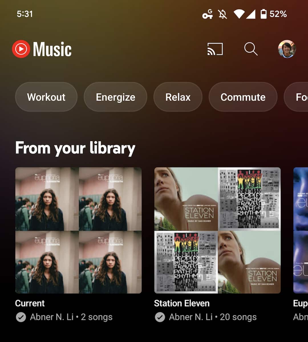 This splash appears at the top of the mobile apps (including the system status bar) and appears behind the app bar (YouTube Music logo, Cast button, search, and your profile avatar). It extends down to the Workout, Energize, Relax, Commute, and Focus carousel — with the pill containers getting particularly emphasized, as well as parts (i.e., the top half) of that first shelf suggestion.