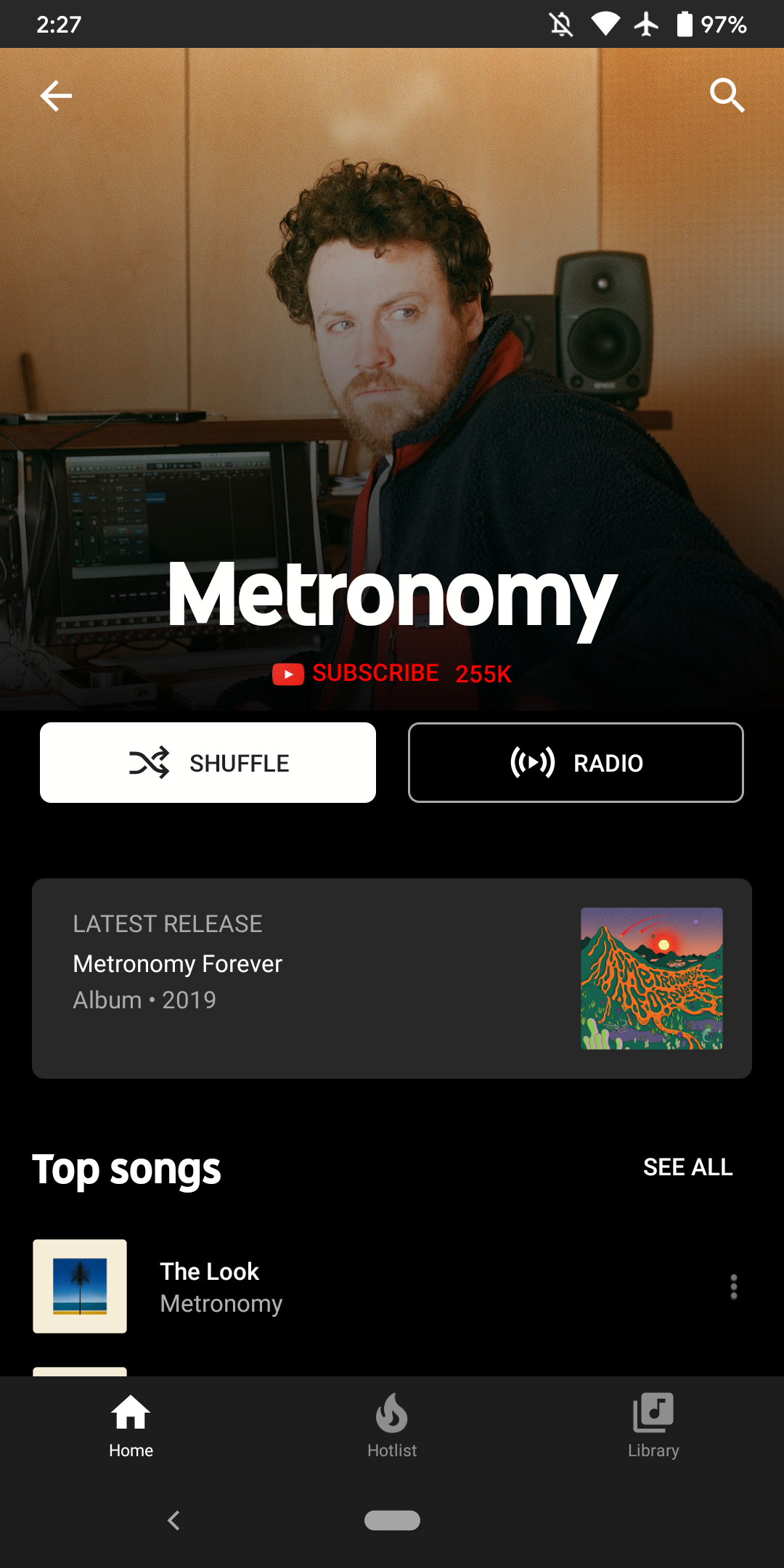 This YouTube Music artist redesign starts with a larger cover image that has a closer crop. As the photo begins to fade, the musician name prominently appears, while the “Subscribe” button with follower count is now centered.